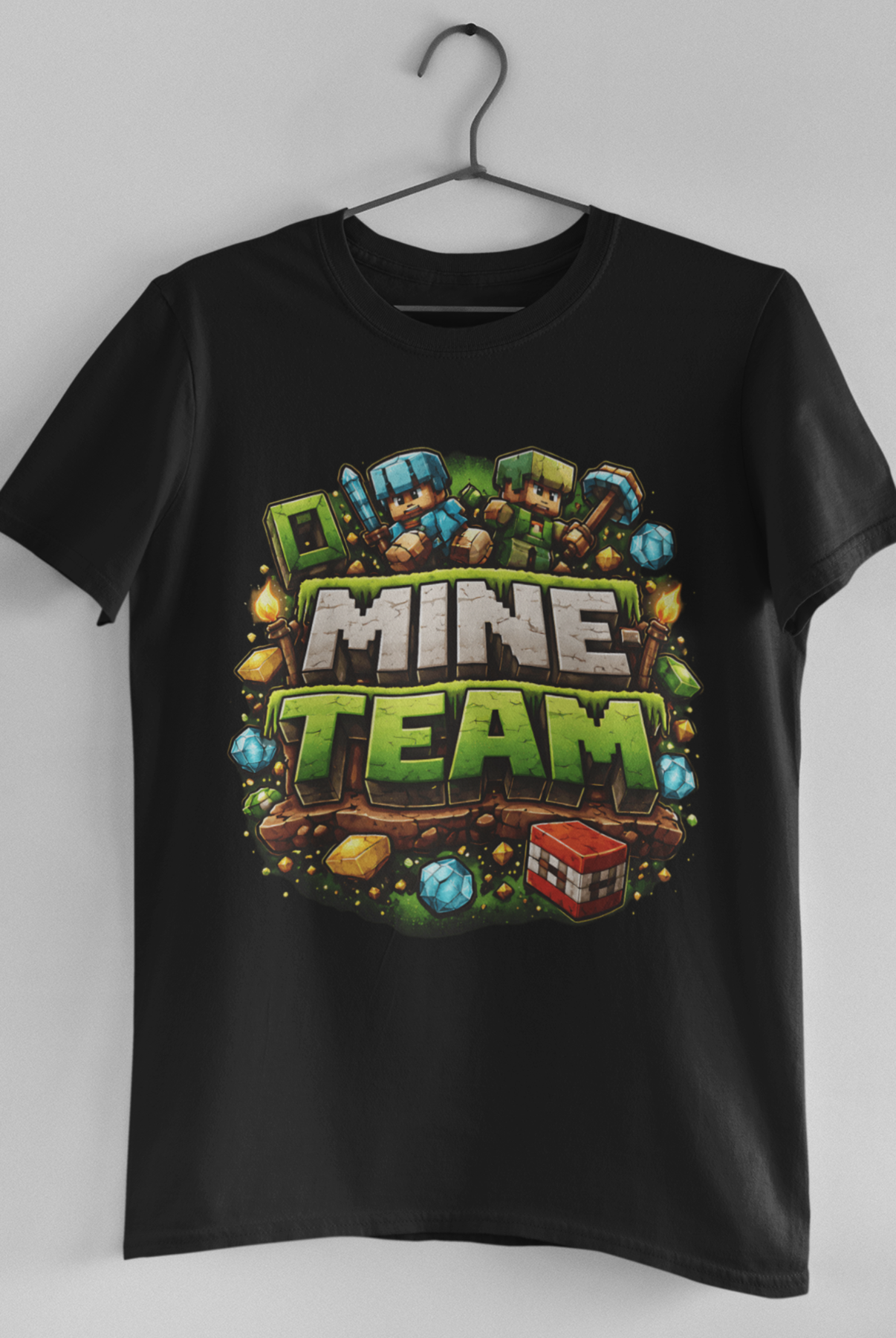 Der markante „MINE-TEAM“ Schriftzug im Pixel-Style steht für Zusammenhalt, Teamplay und kreative Power. Ob im Koop-Modus oder im echten Leben – dieses Shirt zeigt, dass du Teil der Crew bist.